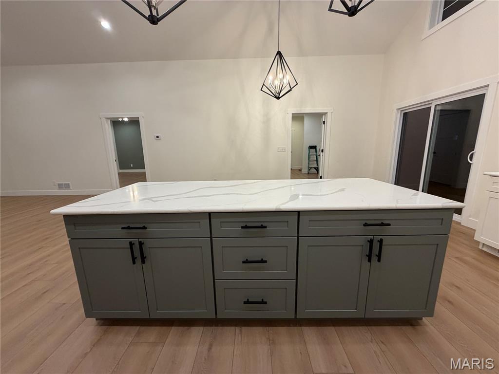 The open-concept kitchen showcases 42” cabinetry topped with crown molding, a spacious island with seating, and a walk-in pantry with adjustable shelving — perfect for everyday living and entertaining. Just off the oversized garage, the laundry room offers abundant cabinetry and generous countertop workspace.