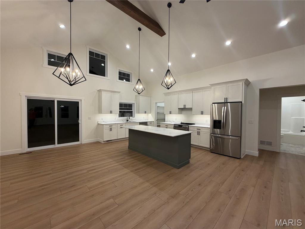 Step inside to soaring 11-foot ceilings that vault to an impressive 16 feet, creating a bright and open living space anchored by a custom plank accent wall with electric fireplace.