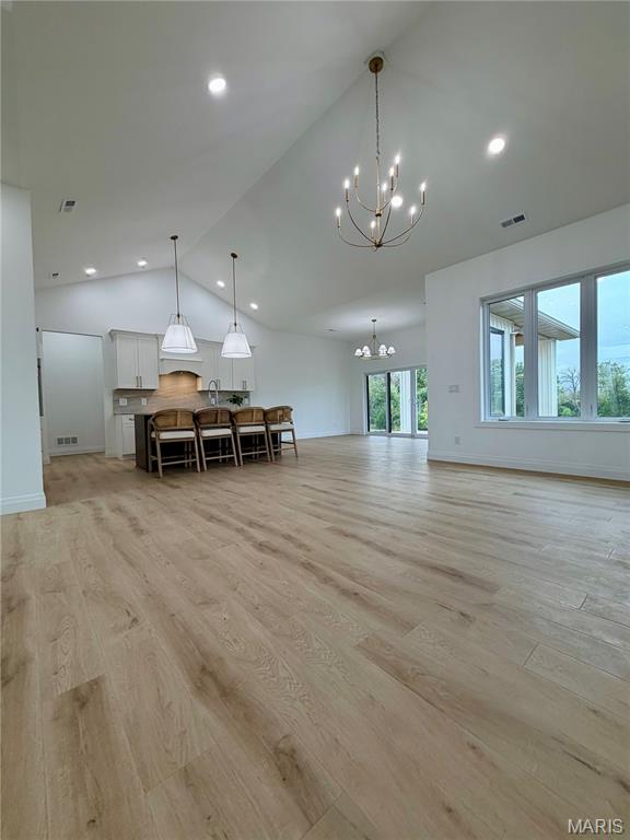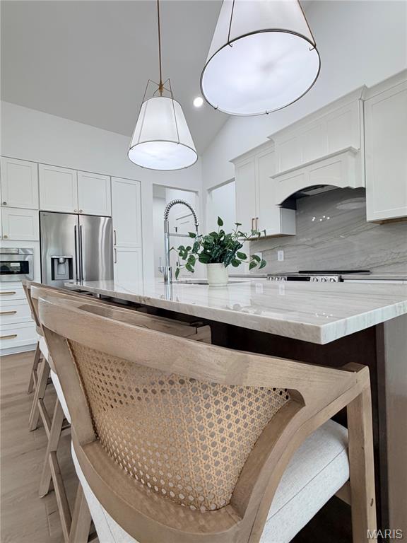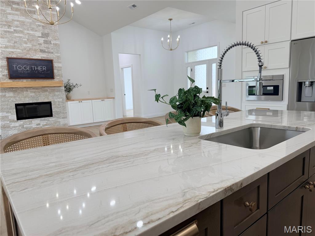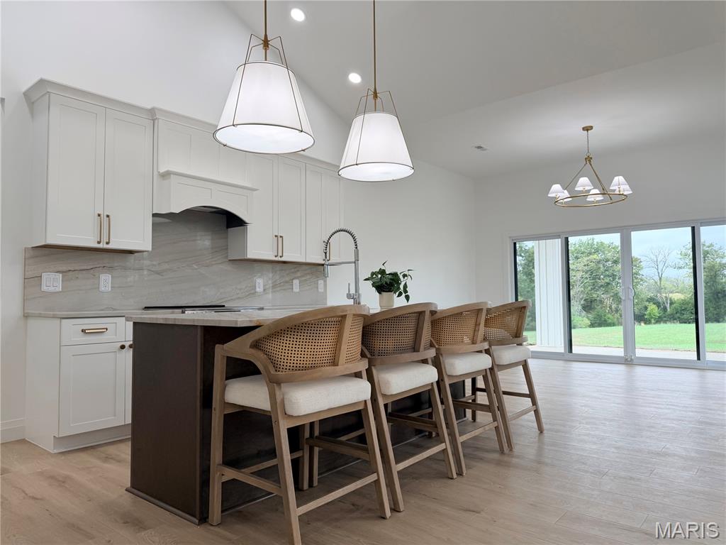 Step inside and be greeted by an impressive 11-foot entryway leading into an open-concept great room and kitchen with cathedral ceilings, creating a bright and airy atmosphere. The chef’s kitchen features custom cabinetry, quartzite countertops, and a full-height quartzite backsplash, paired perfectly with custom lighting to highlight every detail.