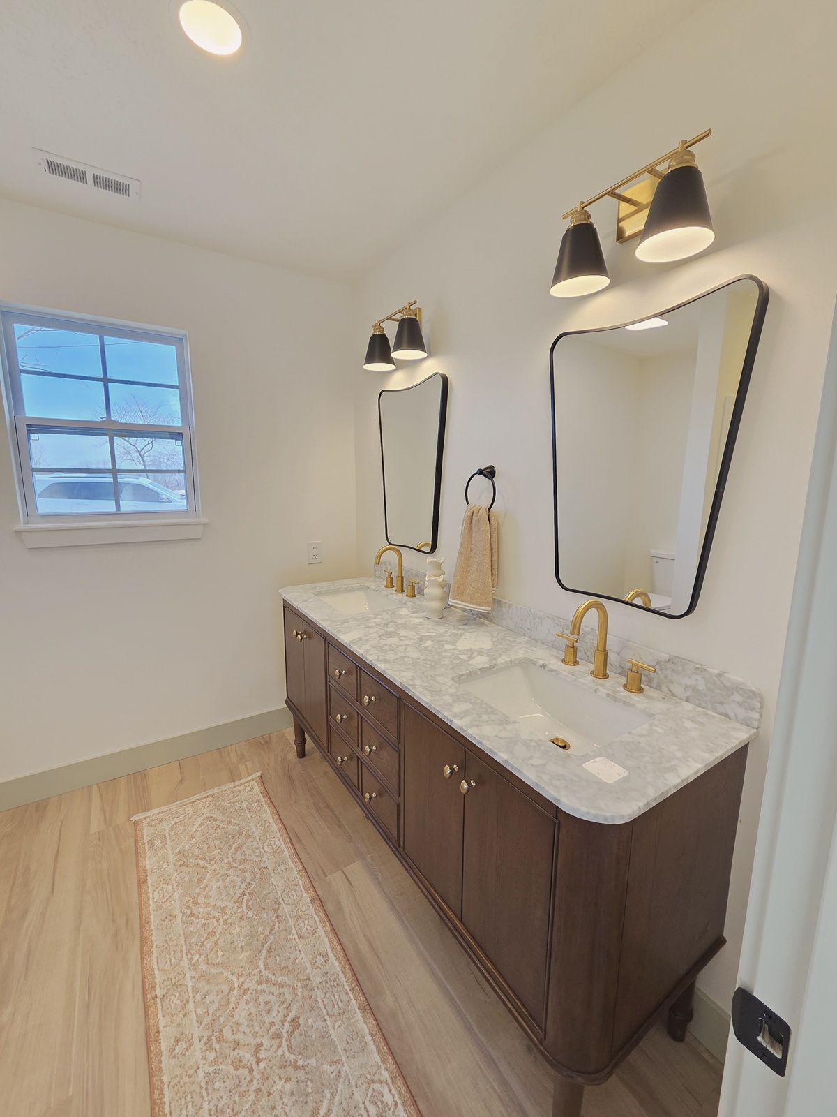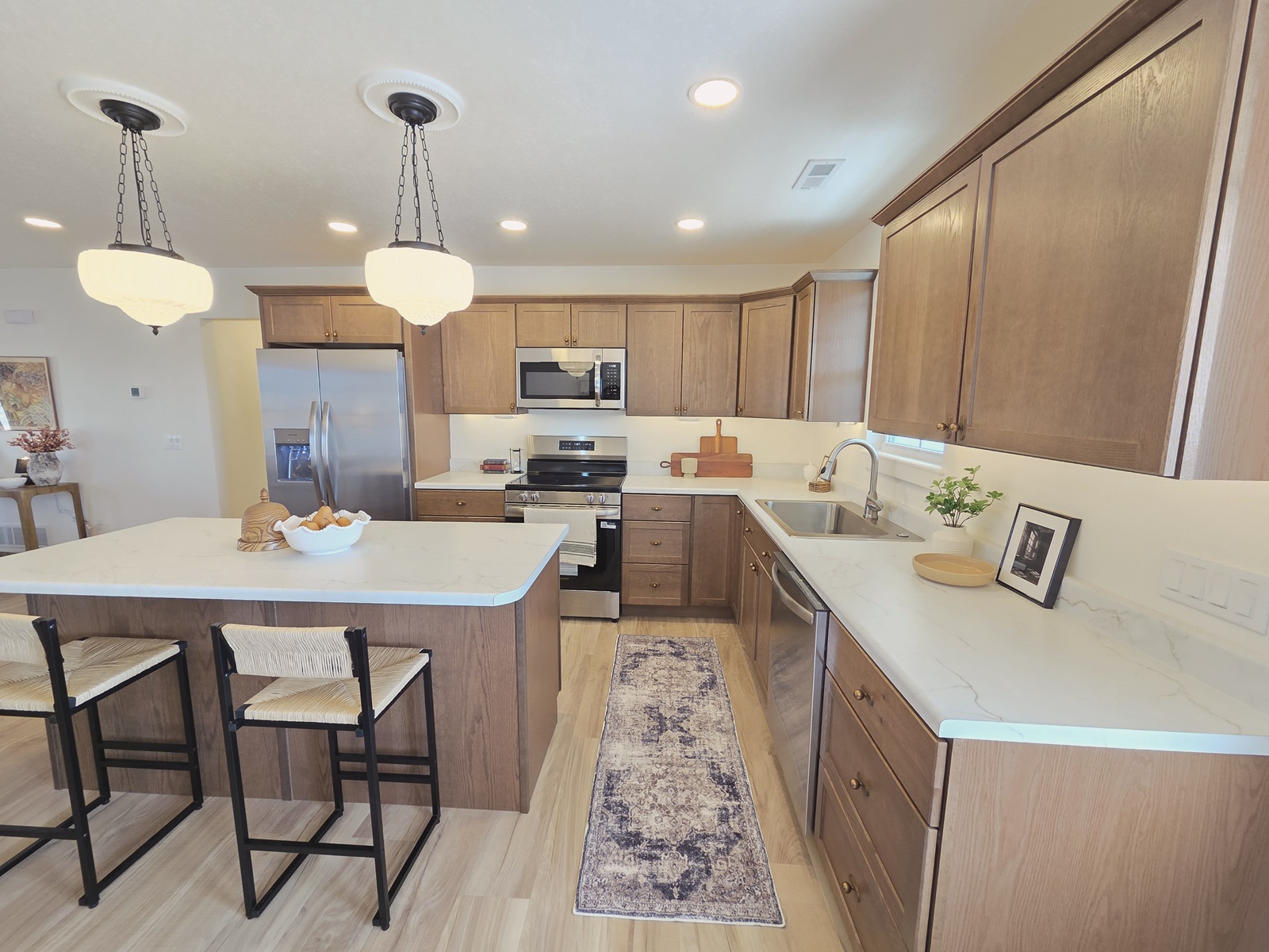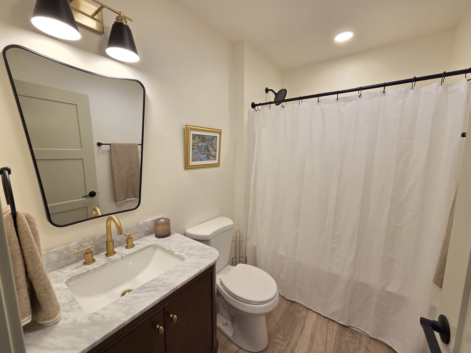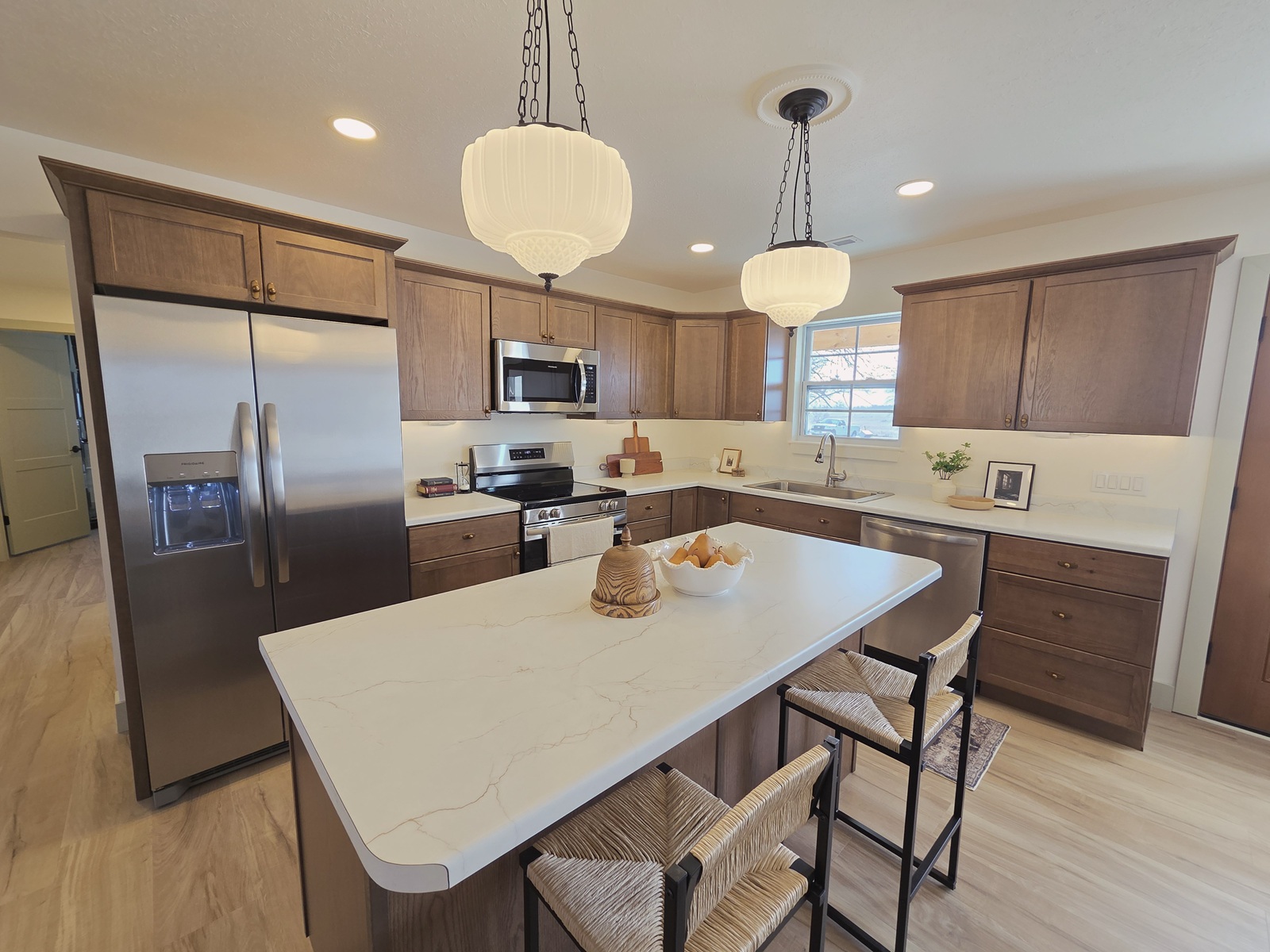 Other amenities include marble-top vanities in both bathrooms, custom fixtures, luxury vinyl plank flooring throughout the home, dimmer switches and remotes for all lighting and fans - indoor and out. The main living area has recessed lighting in the ceiling, as well as undermount cabinet lighting in the kitchen. All new appliances that will convey include washer, dryer, stove, refrigerator, microwave and dishwasher.