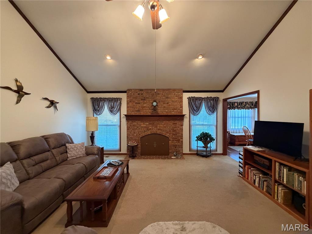 The vaulted living room is the heart of the home, showcasing a gas fireplace creating an inviting atmosphere for relaxing or entertaining. The eat-in kitchen includes a cozy breakfast room with a bay window, providing abundant natural light and a welcoming spot for everyday meals.