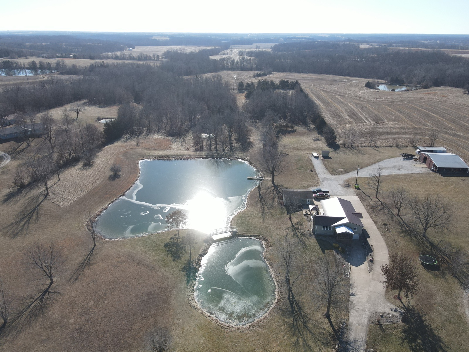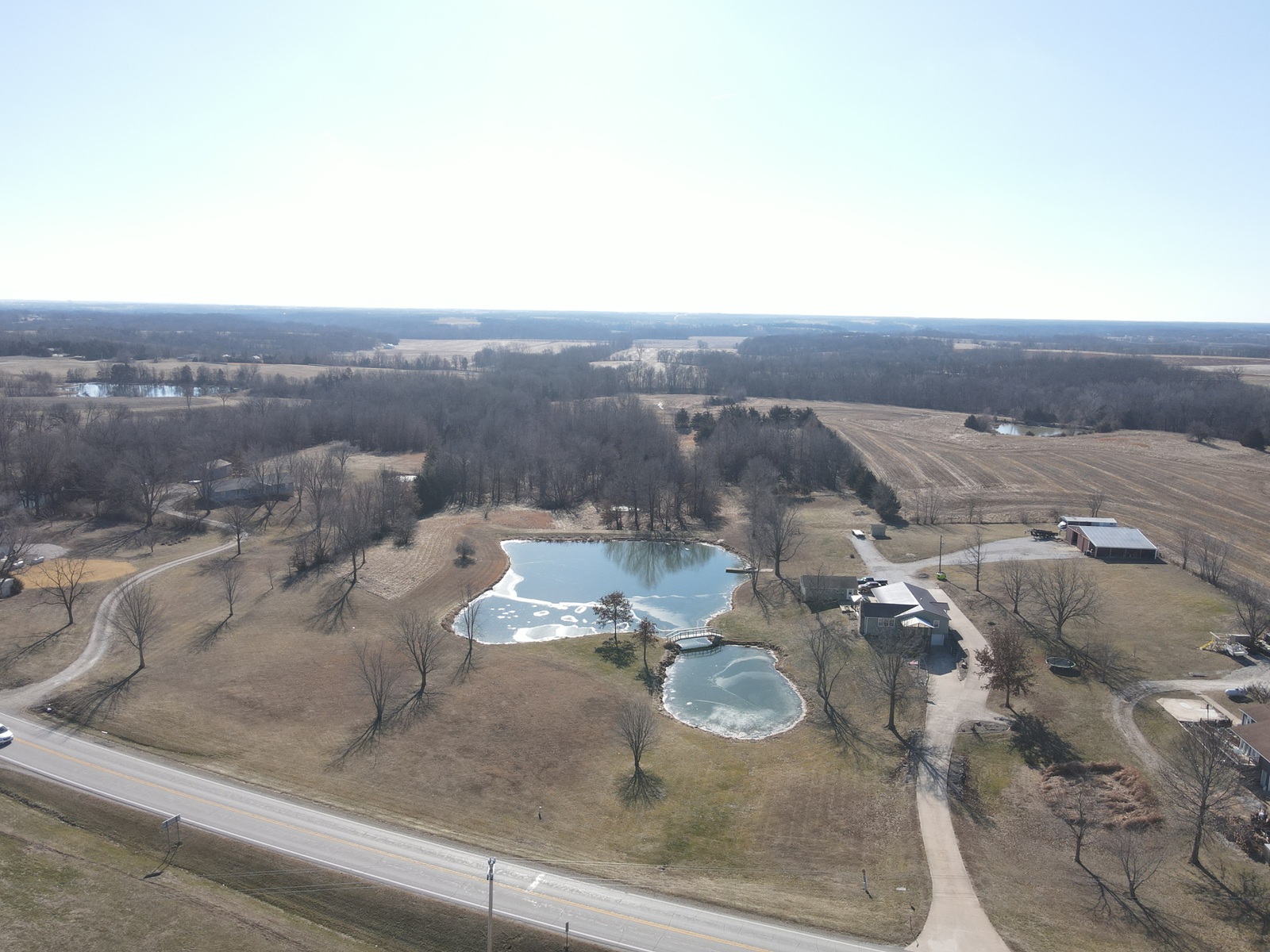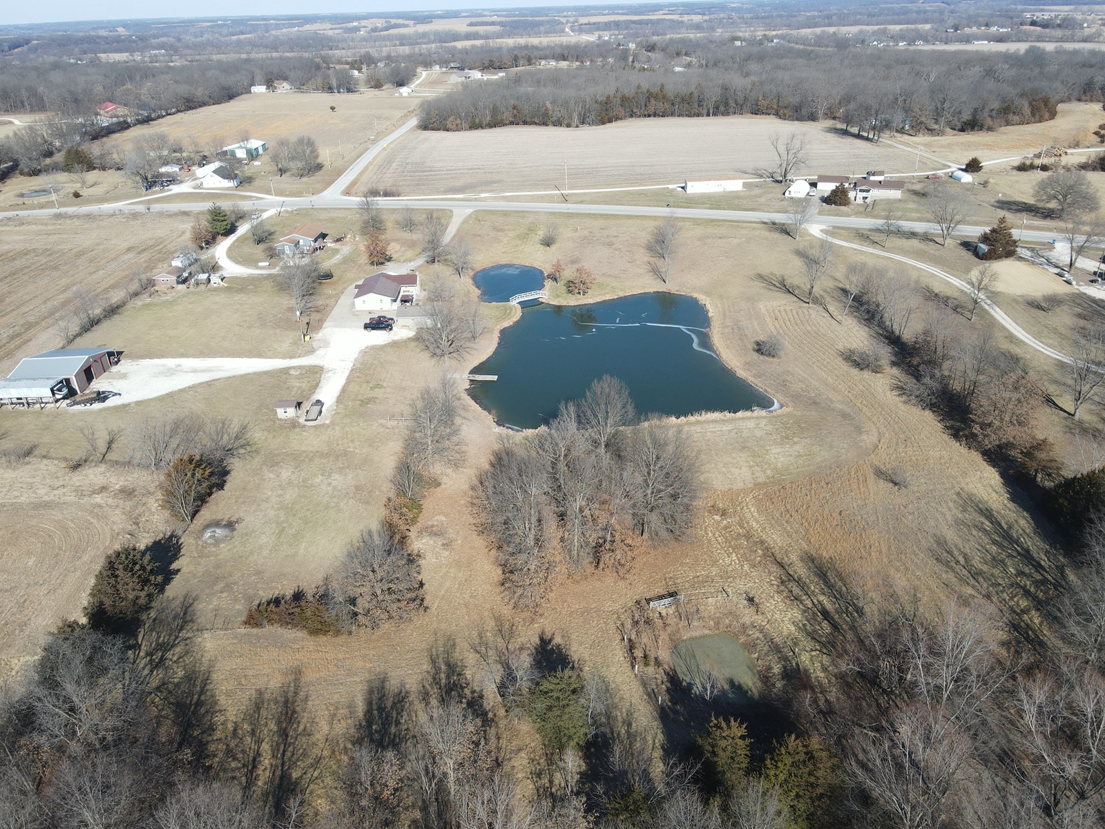 This is what you have been waiting for: 1,712 sq ft ranch home with 3-beds, 2-baths, a full basement, 2-car garage, machine shed, stocked lake, 12.62 acres, paved driveway, Palmyra Schools and only 10 minutes to the Quincy bridge. These certainly don't come along often, and this one may not last long. The home is in immaculate condition and very well-kept, you'll appreciate the open kitchen/dining space with plenty of counter & cabinet space, a kitchen island, stainless steel appliances, and plenty of dining space for the family. Enjoy meals in the dining area or in the front sunroom overlooking the lake! The spacious living room includes a fireplace and gorgeous views out every window. All three bedrooms are on the main level, with two full baths - one includes a double vanity and shower/tub combo. A handy laundry room/entry room provide plenty of additional closet & storage space. Downstairs you'll find a family room, second kitchen, a huge storage room, and there is an overhead garage door for additional parking. A detached 2-car garage also provides workshop space. The private back deck is composite and overlooks the stocked lake, bridge & lighted fountain! A 40x40 machine shed with concrete floors & electric offers more parking, storage & workshop space, and includes a 15x40 lean-to. There are trails through the back acreage and current owners regularly see deer and wildlife!