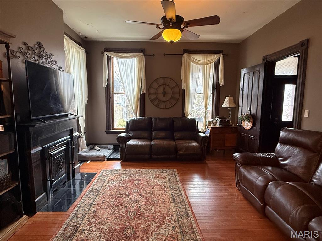 Two-story, brick historic home with four bedrooms and two bathrooms. The home has many original features like hard wood floors, fireplaces, and woodwork. The main level has living room with pocket doors, dining room, bedroom, bathroom with walk-in shower, and kitchen. The kitchen has wood cabinets and appliances convey. Off the kitchen is access to the patio and backyard. The second floor offers three bedrooms, one full bathroom, and laundry room. The main bedroom has a spacious built-in closet area. Home has terraced backyard. Located near downtown Hannibal with over 2,400 square feet of living space.